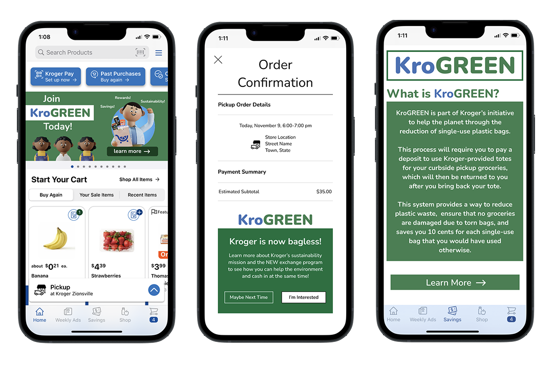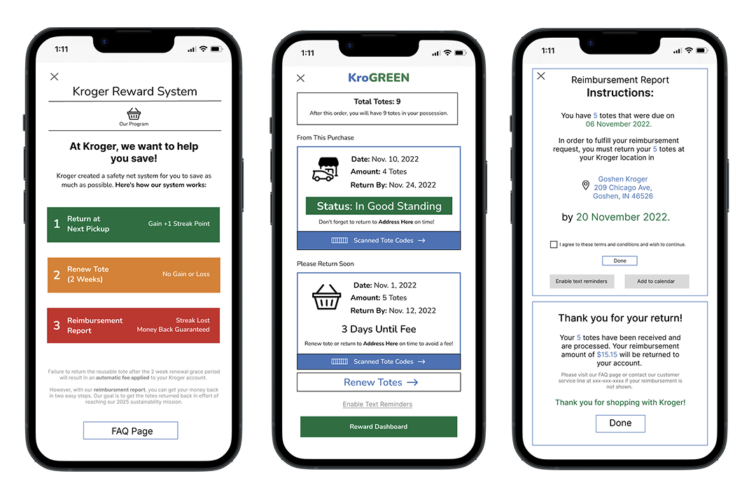 The final deliverable included high-fidelity prototypes and gamified strategies for encouraging continued use of the reusable tote program. These prototypes visualize how education, incentives, and tracking could fit into and possibly improve Kroger’s current pickup flow to create a more sustainable and engaging experience.